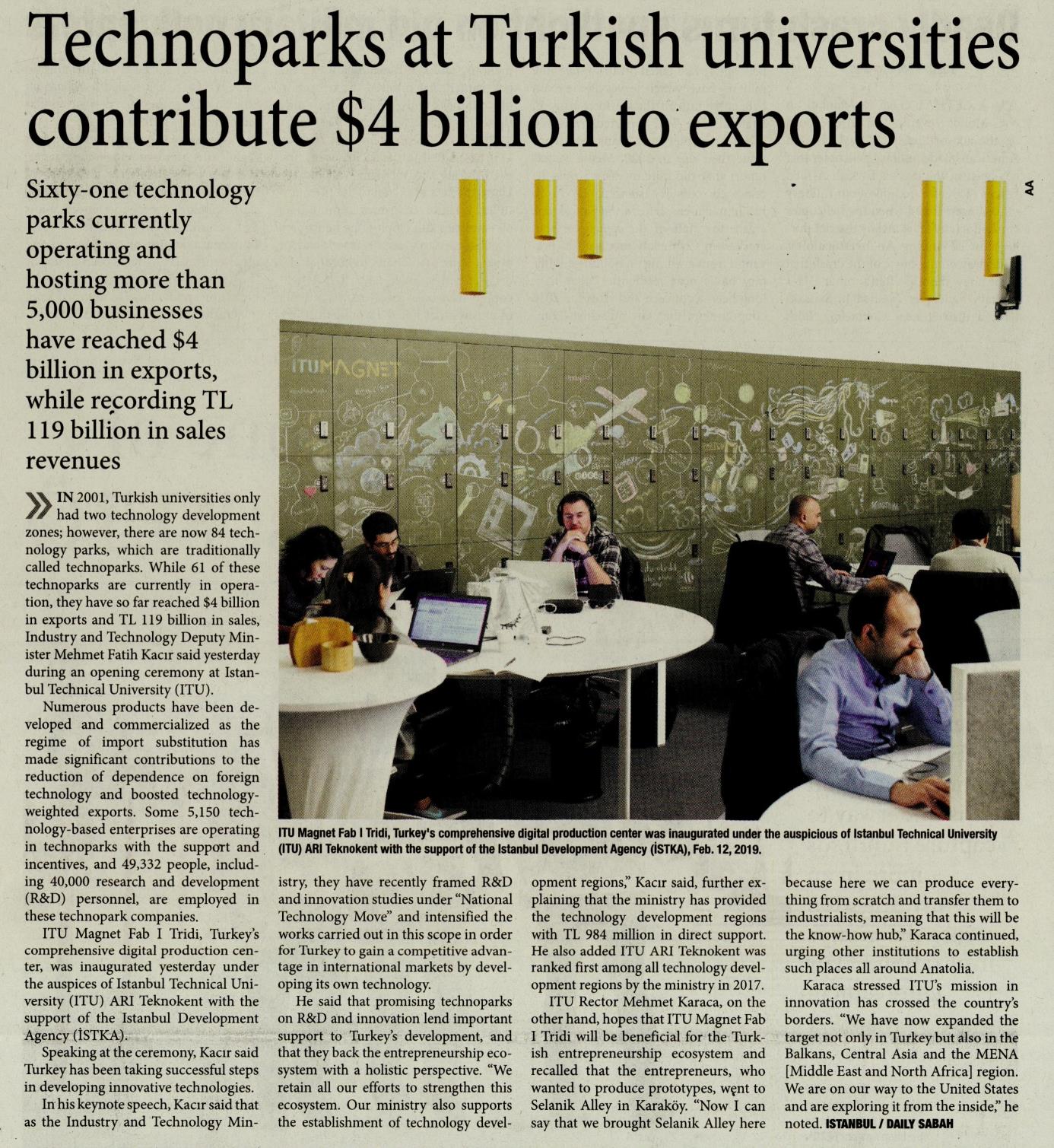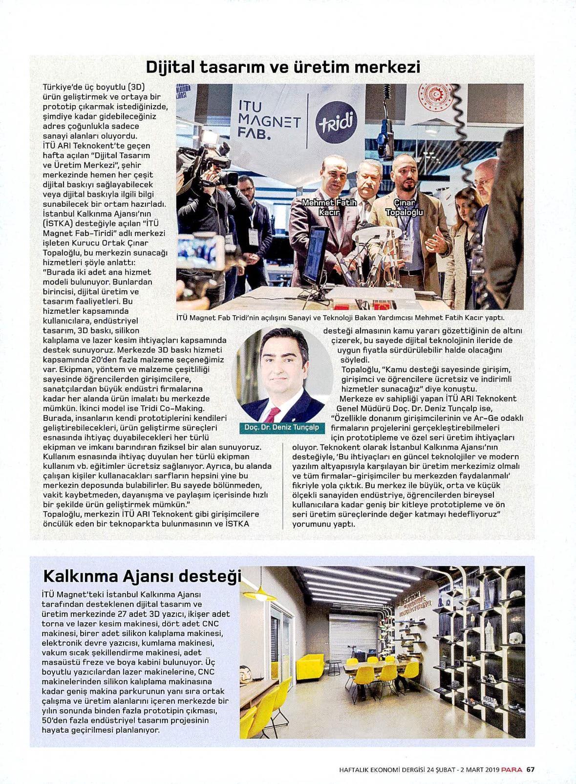 İTÜ ARI Teknokent liderliğinde, İSTKA desteğiyle, Türkiye’nin en kapsamlı dijital üretim merkezi İTÜ MAGNET FAB | TRİDİ açıldı. DÜNYA GAZETESİ – 13.02.2019