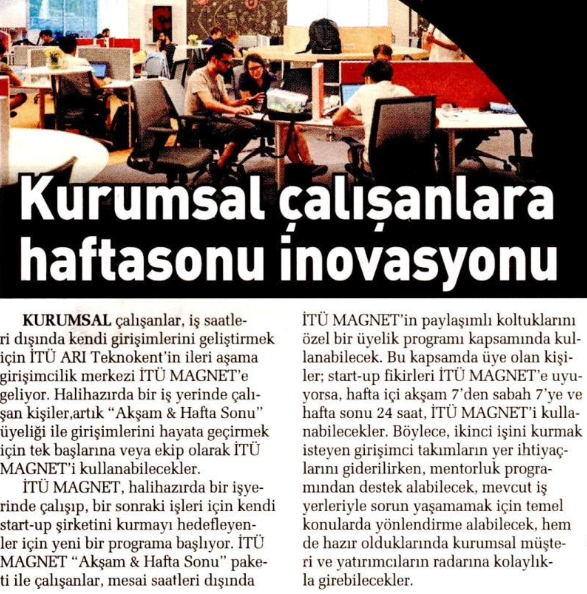 İTÜ ARI Teknokent bünyesinde faaliyetlerini sürdüren İTÜ MAGNET İleri Aşama Girişimcilik Merkezi, “Akşam & Hafta Sonu” paketini hayata geçirdi. HÜRRİYET GAZETESİ 05.05.2019